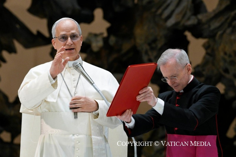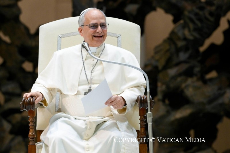 Köszönöm, kedves barátaim, hogy szolgáljátok az igazságot. Azért voltatok Rómában ezekben a hetekben, hogy beszámoljatok az Egyházról, annak sokszínűségéről és egységéről. Figyelemmel kísértétek a nagyhét szertartásait; közvetítettétek a Ferenc pápa halála miatti gyászt, ámde ő a húsvét fényében távozott tőlünk. Ugyanez a húsvéti hit vezetett be bennünket a konklávé szellemébe, mely különösen fárasztó napokat jelentett számotokra; s ez alkalommal is sikerült beszámolnotok Krisztus szeretetének szépségéről, amely mindannyiunkat egyesít, és egyetlen néppé tesz, melyet a Jó Pásztor vezet.