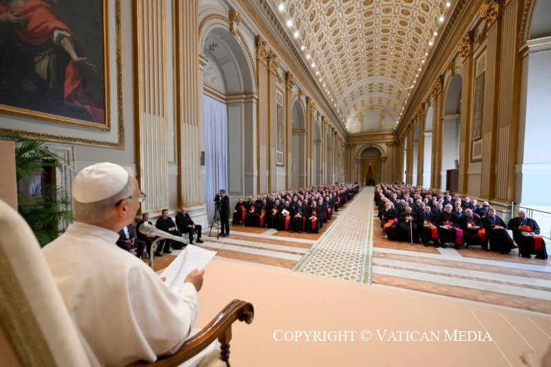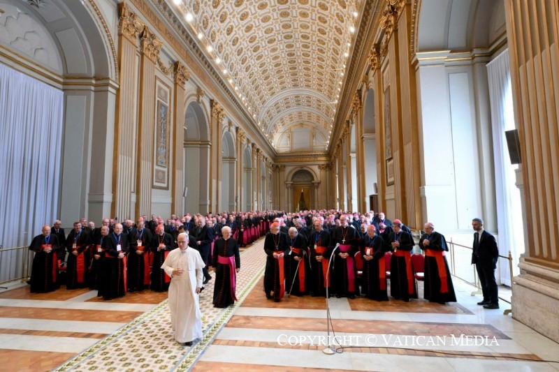 Köszönöm imáitokat és közösségeitek imáit: nagy szükségem van rájuk! Különösen hálás vagyok Zuppi bíboros úrnak, a hozzám intézett szavaiért is. Köszöntöm a három alelnököt, a főtitkárt, és köszöntelek mindannyiatokat. Az olaszországi egyház története nyilvánvalóvá teszi azt a különleges köteléket, amely összeköt benneteket a pápával, és amely – az Olasz Püspöki Konferencia alapszabálya szerint – „különleges módon meghatározza a konferenciának a római pápával való közösségét” (4. cikk 2. §). Elődeim példájához hasonlóan én is érzem ennek a „közös és különleges” kapcsolatnak a jelentőségét, ahogyan azt Szent VI. Pál jellemezte, amikor az Olasz Püspöki Konferencia első közgyűlésén felszólalt (vö. Beszéd, 1966. június 23.).