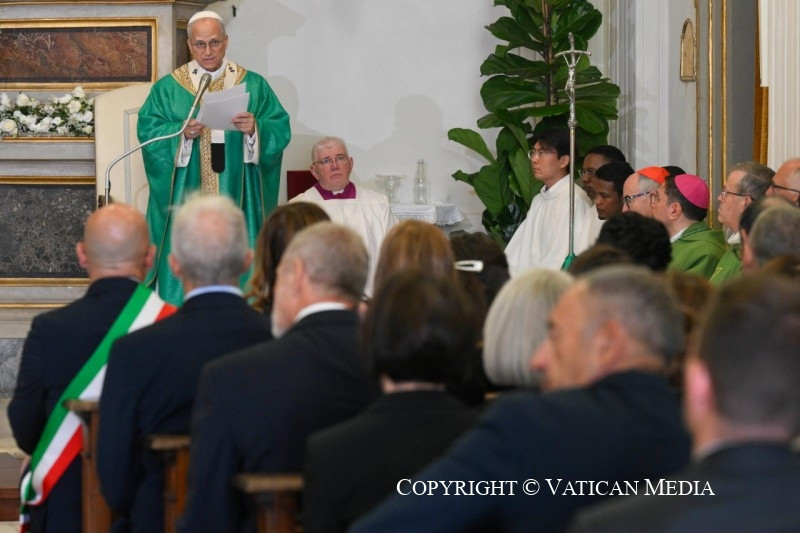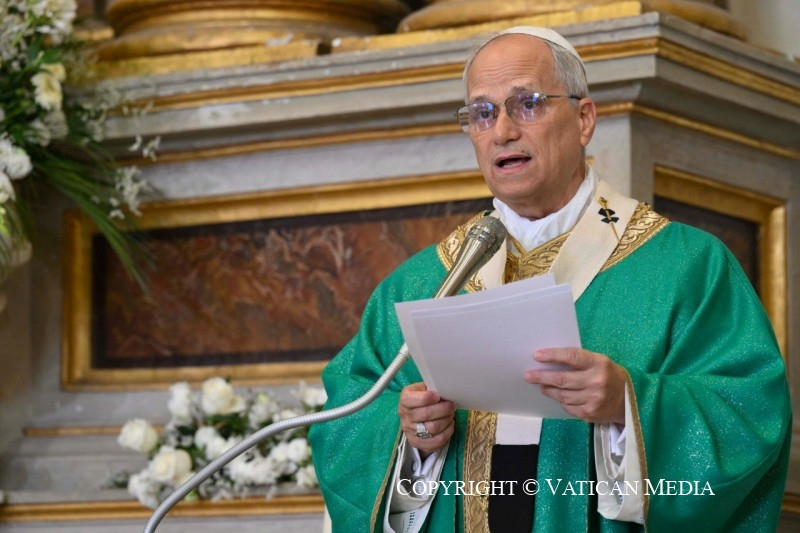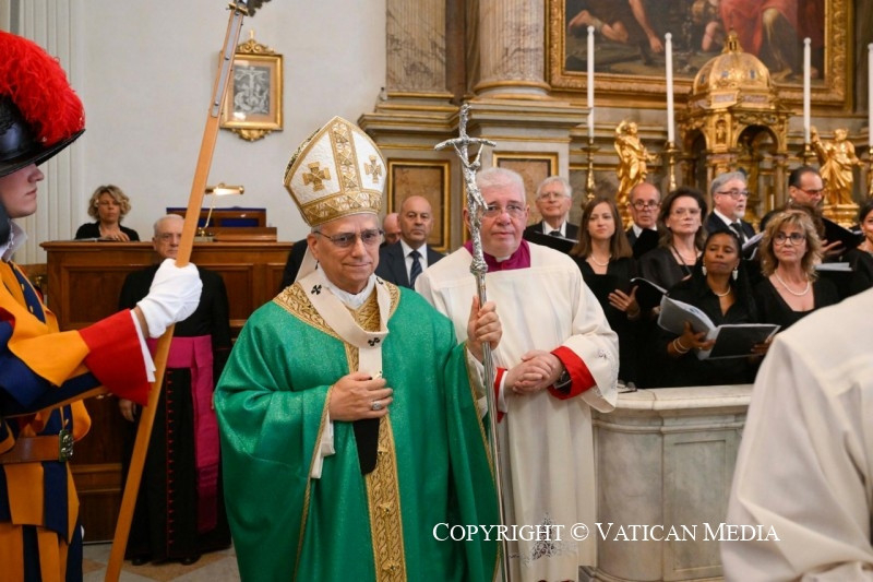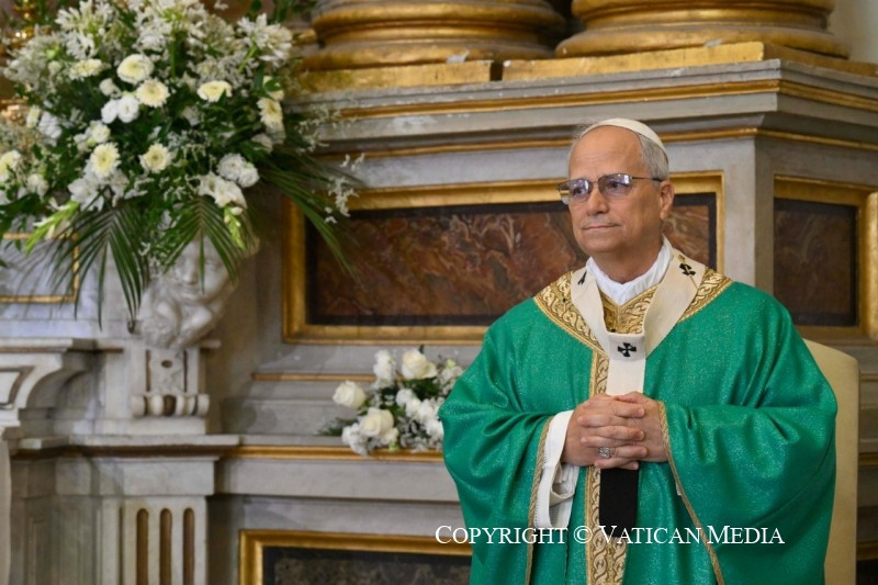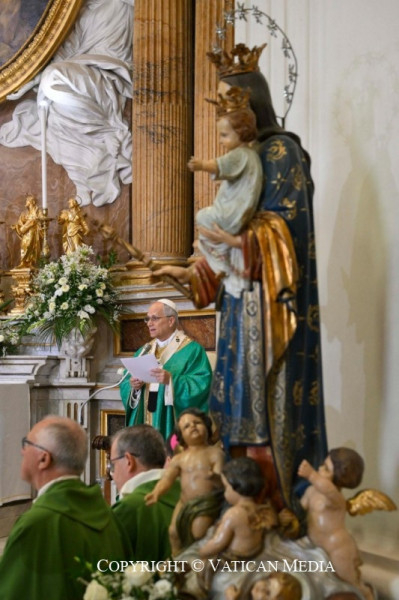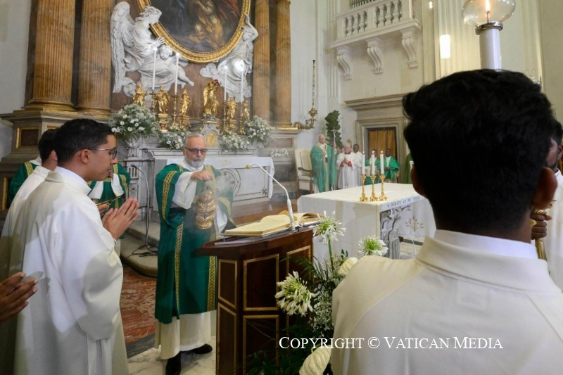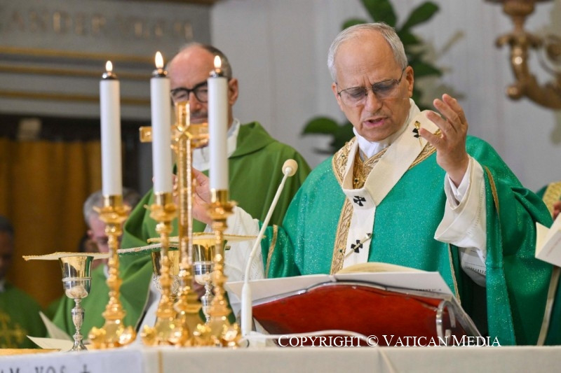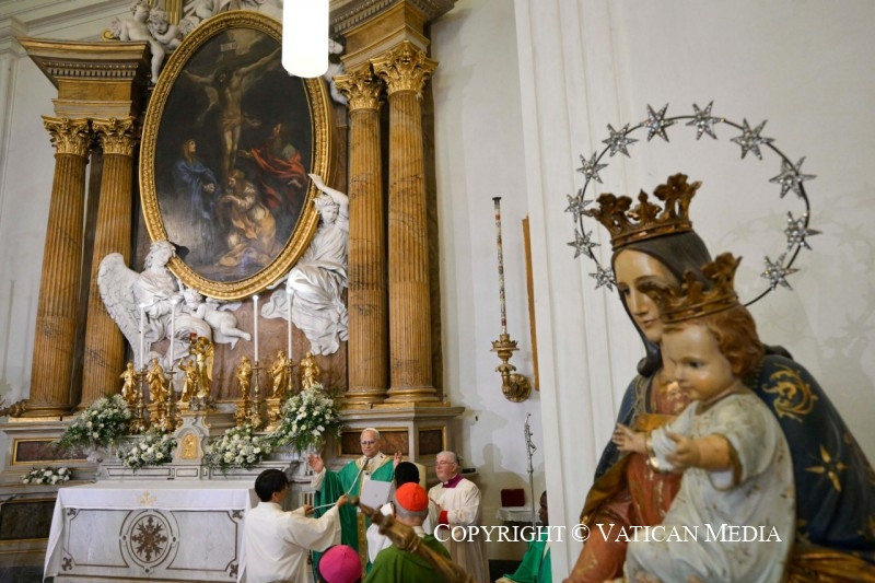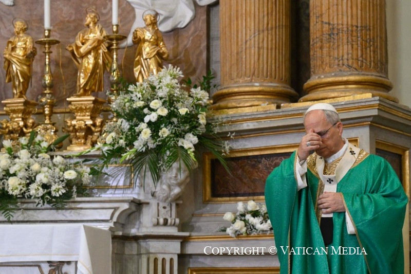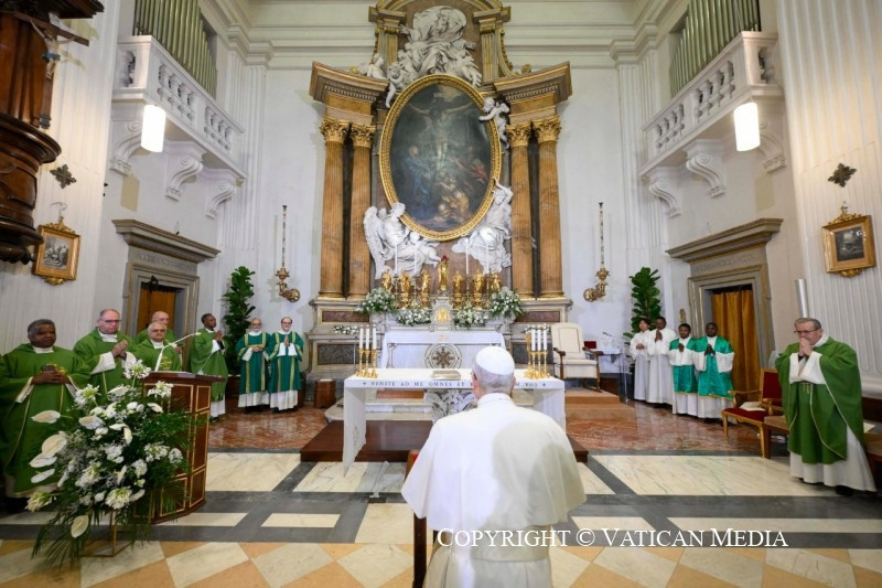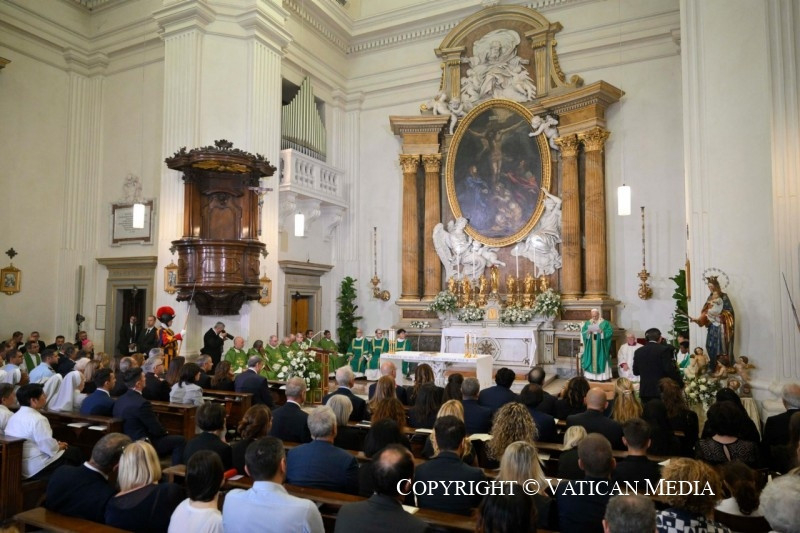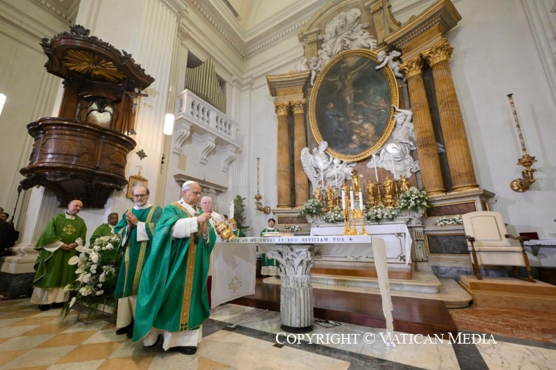 Ez a templom néhány lépésre található a pápai rezidenciától. A Szentatya nyitott elektromos autóval érkezett, a helyi lakosok, hívek, zarándokok lelkes tömege fogadta, akiket rövid beszéddel üdvözölt. A Bernini által tervezett templomban, mely a spanyol Ágoston-rendi Villanovai Szent Tamás nevét viseli, a pápa a mise előtt térden állva imádkozott az Oltáriszentség előtt, miközben a kórus a „Tu es Petrus” – „Te vagy Péter” himnuszt énekelte. A misén koncelebrált Michael Czerny bíboros, az Átfogó Emberi Fejlődés Dikasztériumának jezsuita prefektusa.