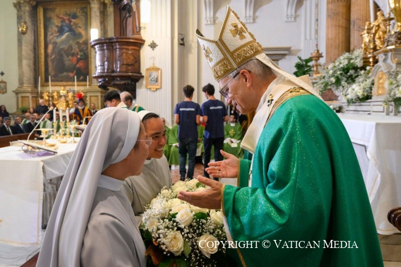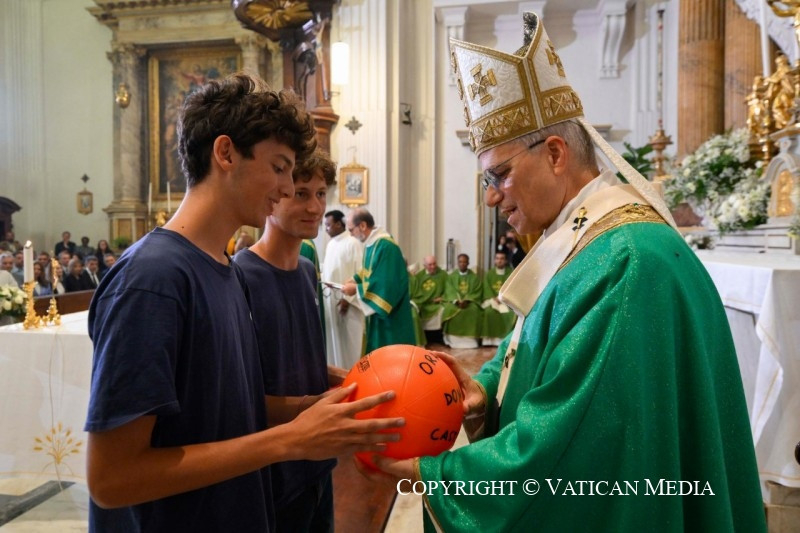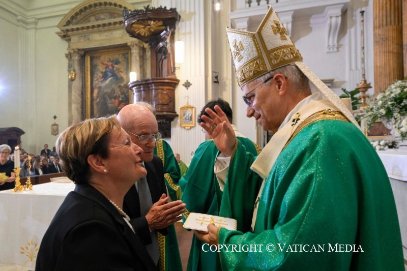 Most szeretnék egy kis ajándékot átadni e pápai plébánia plébánosának a mai szentmisénk emlékéül. [Tapsolnak.] A paténa és a kehely, mellyel az eucharisztiát ünnepeljük, a közösségteremtés eszközei, és mindannyiunk számára meghívást jelenthetnek arra, hogy egymással közösségben éljünk, hogy valóban előmozdítsuk ezt a testvériséget, ezt a közösséget, amelyet Jézus Krisztusban élünk.