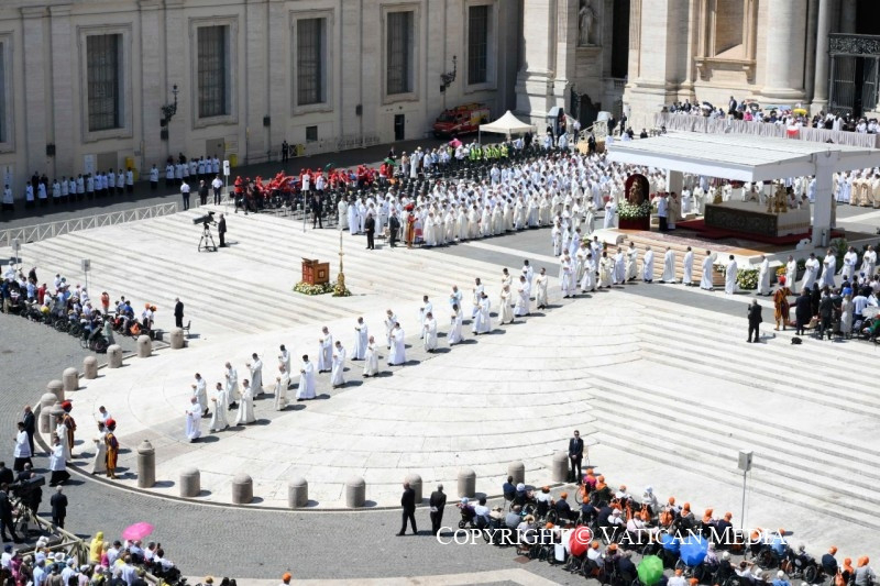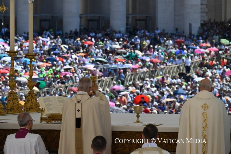 És még egy utolsó dolgot szeretnék hozzátenni. Isten Fiának imája, mely reményt ad nekünk az úton, arra is emlékeztet bennünket, hogy egy napon mindannyian uno unum leszünk (vö. Szent Ágoston: Zsoltármagyarázatok, 127): egyek az egyetlen Megváltóban, akiket Isten örök szeretete ölel át. Nemcsak mi, hanem azok az apák és anyák, nagymamák és nagypapák, fivérek, nővérek és gyermekek is, akik előttünk járnak az ő örök húsvétjának fényében, és akikről úgy érezzük, itt vannak velünk ebben az ünnepi pillanatban.