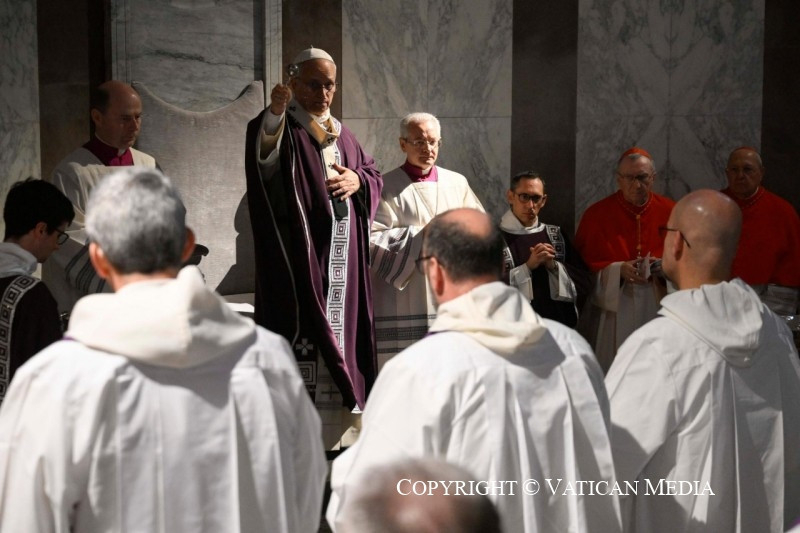 „Hol van hát Istenetek?” – kérdezik a népek. Igen, kedves testvéreim, ezt kérdezi tőlünk a történelem, de azt megelőzően a lelkiismeretünk: nevezzük nevén a halált, hordozzuk magunkon a jeleit, de tegyünk tanúságot a feltámadásról! Bűneink felismerése, hogy megtérjünk, már a feltámadás előjele és róla való tanúságtétel: azt jelenti ugyanis, hogy nem maradunk a hamuban, hanem felállunk és újjáépítünk. Akkor a húsvéti szent háromnap, melyet majd nagyböjti utunk csúcspontján ünneplünk, feltárja teljes szépségét és jelentését. Úgy teszi ezt, hogy a bűnbánat által bevon bennünket az átmenetbe a halálból az életre, a tehetetlenségből Isten lehetőségeibe.