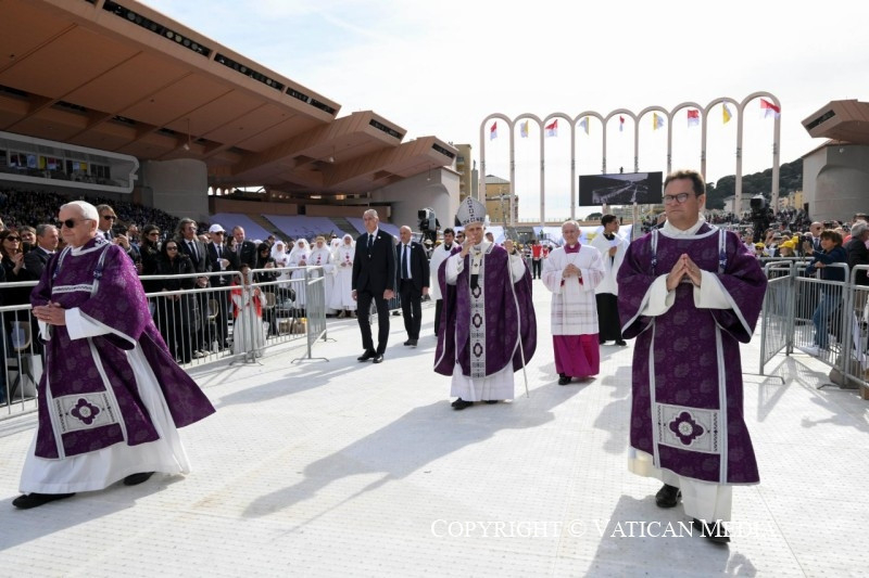 A monacói egyház hivatása az, hogy békében és Isten áldásában élve tanúságot tegyen: ezért, kedves testvéreim, tegyetek sokakat boldoggá hitetekkel, valódi örömet árasszatok, olyat, amelyet nem megszerezni, hanem szeretetben megosztani kell. Ennek az örömnek a forrása Isten szeretete: szeretet a születő és szükséget szenvedő élet iránt, amelyet mindig be kell fogadni és amelyről mindig gondoskodni kell; szeretet a fiatal és idős élet iránt, amelyet minden életkor próbatételei között bátorítani kell; szeretet az egészséges és beteg, olykor magányos élet iránt, amely mindig gondoskodásra szorul. Segítsen benneteket a Boldogságos Szűz Mária, védőszentetek: Szent Devota, hogy a befogadás helyévé váljatok, ahol a kicsinyek és szegények méltóságra találnak, és ahol biztosítva van az emberek teljes körű és inkluzív fejlődése.