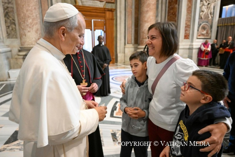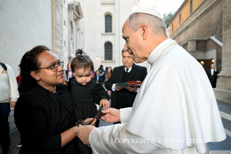 Szeretném kifejezni hálámat a szeretetszolgálat munkatársainak, a sok önkéntesnek, mindazoknak, akik a legszegényebbek helyzetének enyhítésével foglalkoznak, egyúttal szeretném arra bátorítani őket, hogy egyre inkább a társadalom kritikus lelkiismerete legyenek. Jól tudjátok, hogy a szegények kérdése hitünk lényegéhez vezet vissza, hiszen számunkra ők Krisztus saját teste, és nem csupán szociológiai kategória (vö. Dilexi te, 110). Ezért „az Egyház mint anya együtt halad mindazokkal, akik úton vannak. Ahol a világ fenyegetést lát, ott ő gyermekeit látja: ahol falakat emelnek, ő hidakat épít” (uo. 75).