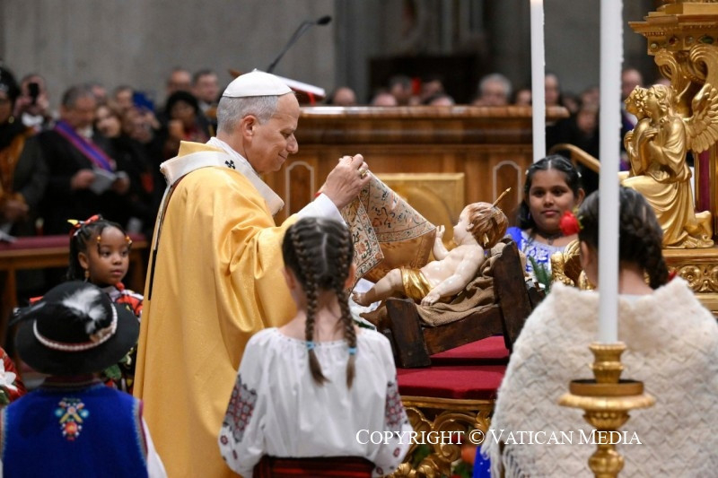 A szentmise záróaldását követően Szentatya kezébe vette a jászolból a gyermek Jézust, akit a Föld öt kontinenséról érkezett gyermekek kiséretében a Szent Péter-bazilikában felállított betlehemhez vittek, ahol elhelyezték a Megváltót.