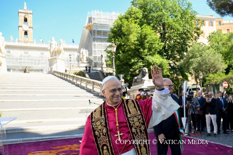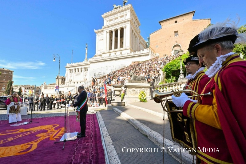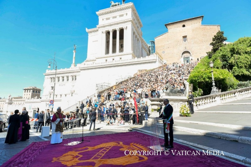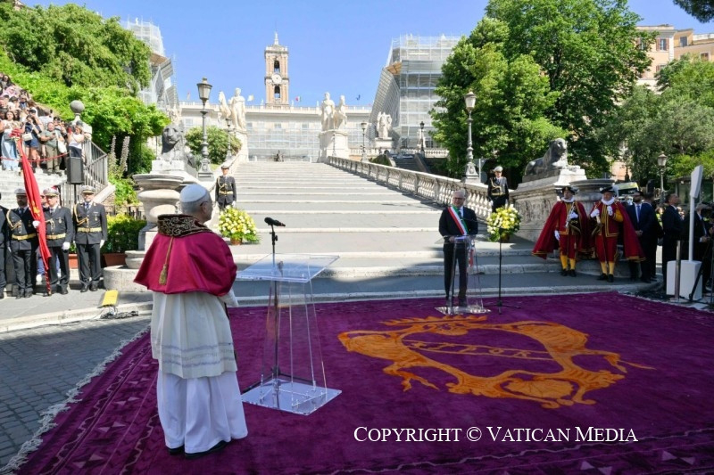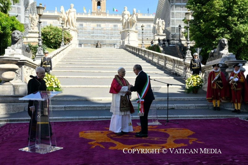 Polgármester úr, kívánom, hogy a történelmi és művészeti örökségének gazdagsága miatt páratlan Róma mindig kitűnjön az emberség és civilizáció azon értékeivel is, amelyek az evangéliumból kapják életerejüket. Ezekkel az érzésekkel adok apostoli áldást erre a városra és összes lakójára.