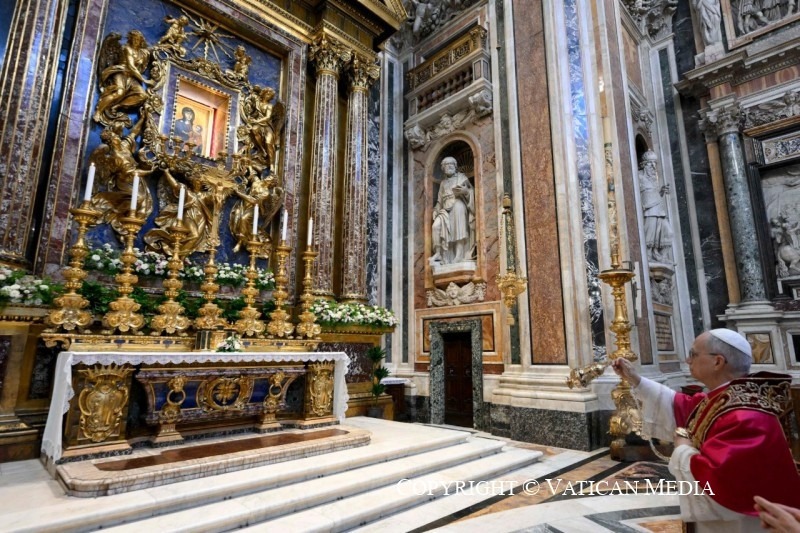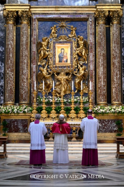 Szeretnék köszönetet mondani mindazoknak, akik ebben a bazilikában dolgoznak, a két bíborosnak, akik ma este kísérnek engem, és annak a sok embernek, akik elkötelezetten segítenek nekünk imádságos, áhítatos életet élni, és mindenekelőtt segítenek közelebb kerülni Jézus anyjához, Isten anyjához, a Boldogságos Szűz Máriához. Ez egy gyönyörű alkalom arra, hogy megújítsuk a Mária, a Salus Popoli Romani iránti áhítatunkat, aki sokszor kísérte a római népet szükségeiben.