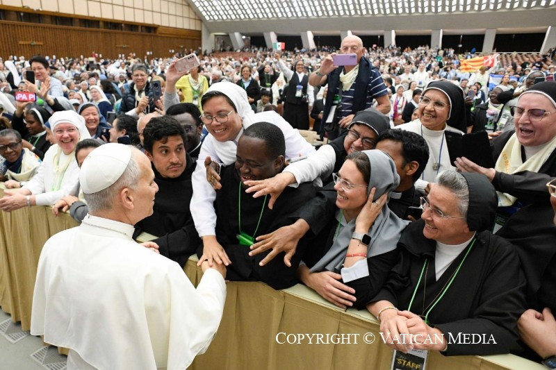 Életetek, szervezeti felépítésetek, szerzetes intézményeitek gyakran ténylegesen nemzetközi és interkulturális jellege mind olyan helyzetbe hoz benneteket, amely kiváltságos lehetőséget ad arra, hogy nap mint nap gyakoroljatok olyan értékeket, mint egymás meghallgatása, a részvétel, a vélemények és képességek megosztása, közös utak keresése a Szentlélek hangjára figyelve. Az Egyház ma azt kéri tőletek, hogy legyetek különleges tanúi mindezeknek életetek különféle dimenzióiban, elsősorban azzal, hogy közösségben vagytok Isten nagy családjával, anyának és tanítónak tekintve azt, megosztva benne hivatásotok örömét, és – ahol szükséges – legyőzve a megosztottságokat, megbocsátva elszenvedett igazságtalanságokat, és bocsánatot kérve az önelégültségből fakadó elzárkózásaitokért. Dolgozzatok azon, hogy napról napra egyre inkább a „szinodalitás szakértőivé” váljatok, hogy ennek prófétái lehessetek Isten népe szolgálatában.