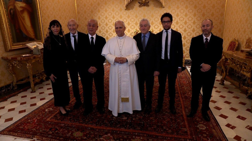 Először nevetés hallatszott – olyan nevetés, ami akkor tör elő, amikor szemtől szembe találod magad valakivel, akinek az arcát már számtalanszor láttad a képernyőn és a magazinokban, és most ott áll előtted. Aztán jött az üdvözlés – a pápa szólalt meg elsőként: „Jó reggelt! Örülök, hogy találkozhatok Önnel!” „Én is” – válaszolta Robert De Niro.