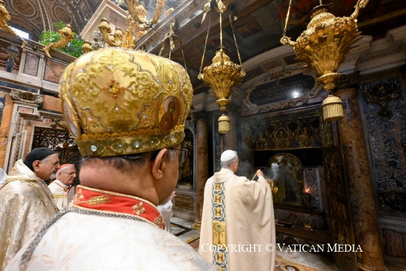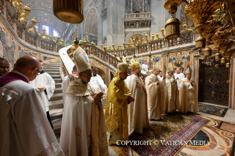 – hangzott az ének, miközben Leó pápa a keleti hierarchákkal együtt lement Péter apostol sírjához, ahol egy-egy tálcán el volt helyezve a pallium, a hozzátartozó szögekkel, és a halászgyűrű. A Szentatya csendben imádkozott, majd a bíborosok hosszú menete elindult a bazilikán át a Szent Péter tér felé. A palliumot és a halászgyűrűt diakónusok az ünnepi körmenet részeként vitték az oltárra.