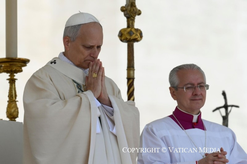 Az Ad multos annos! köszöntés után Isten népe – a különböző világrészek és életállapotok – képviseletében hűséget fogadtak az új pápának, aki ezután mondta el az alább – Török Csaba fordításában – teljes egészében olvasható homíliáját.