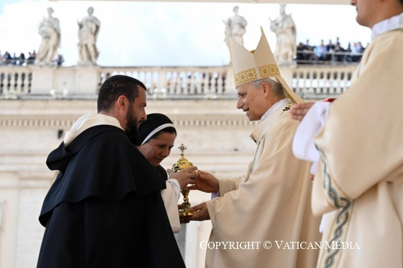 Ezt követően a bíborosi kollégium diakónusi rendjének tagja, Dominique Mamberti bíboros (Európa), a testület protodiakónusa (ő hirdette ki az új pápa személyét a megválasztását követően a Szent Péter-bazilika áldások erkélyén – a szerk.), miután fohászkodott az új Szentatyáért, feladta rá a palliumot, majd Diego Ravelli pápai szertartásmester a sebhelyeket jelképező fekete keresztekbe beleillesztette a szögeket. Őt követte a bíborosi kollégium presbiteri kollégiumának a tagja, Fridolin Ambongo Besungu kongói bíboros, kinshasai érsek (Afrika), aki könyörgött XIV. Leó péteri szolgálatáért. Végül a bíborosi kollégium püspöki rendjének tagja, Luis Antonio Tagle bíboros (Ázsia), miután imádkozott az új pápáért, ujjára húzta a halászgyűrűt. XIV. Leó ezt követően láthatóan elérzékenyült, miközben a téren az ünneplők tapsban törtek ki tiszteletük és elismerésük jeléül.