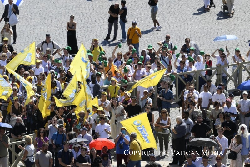 [Olaszul folytatja] Holnap, szeptember 1-jén lesz a teremtésvédelem imanapja. Ezt a világnapot tíz évvel ezelőtt vezette be Ferenc pápa – I. Bartolomaiosz ökumenikus pátriárkával összhangban – a Katolikus Egyház számára. Ez a nap fontosabb és sürgetőbb, mint valaha, és idén „A béke és remény magjai” a témája. Ezt a világnapot az összes kereszténnyel együtt tartjuk és hosszabbítjuk meg a „Teremtés időszakában” október 4-ig, Assisi Szent Ferenc ünnepéig. Az általa nyolcszáz évvel ezelőtt írt Naphimnusz szellemében dicsőítsük Istent, és újítsuk meg elkötelezettségünket, hogy nem romboljuk az ő ajándékát, hanem gondját viseljük közös otthonunknak!