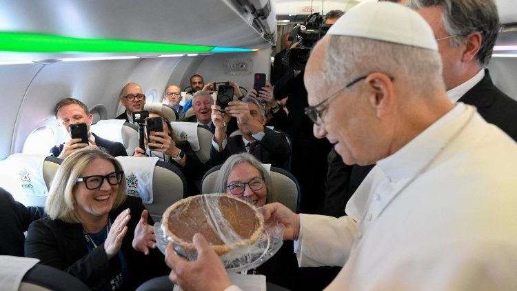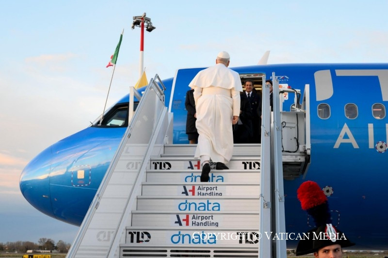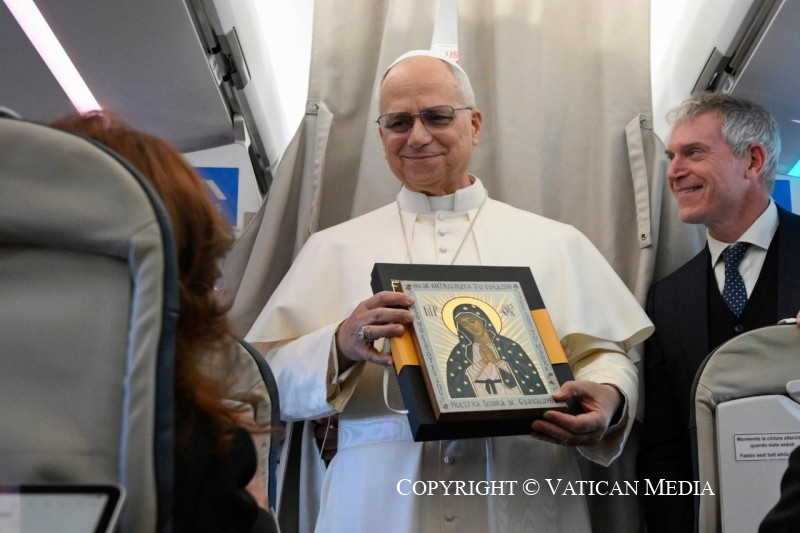 „Az itt lévő amerikaiaknak jó hálaadást (Thanksgiving) kívánok! Ez egy gyönyörű nap az ünneplésre, és szeretném azzal kezdeni, hogy köszönetet mondok mindannyiótoknak a Vatikánnak, a Szentszéknek és nekem, de az egész világnak is nyújtott szolgálatotokért.” A Szentatya mosolyogva beszél angolul a mikrofonba a nyolcvanegy újságíró, operatőr és fotós előtt, akik mintegy húsz nemzetközi médiaorgánum nevében kísérik el első apostoli útján. Az ITA Airways Airbus 320neo repülőgépének szürke függönye előtt áll – a gép 7.58-kor szállt fel –, ahonnan az első, neki fenntartott helyen a Szent Ágoston fiai számára kedves Jó Tanács Anyja-kegykép látható, az ikont Genazzano településen őrzik, ahova az újonnan pápává választott Robert Francis Prevost már két nappal a konklávé után ellátogatott.