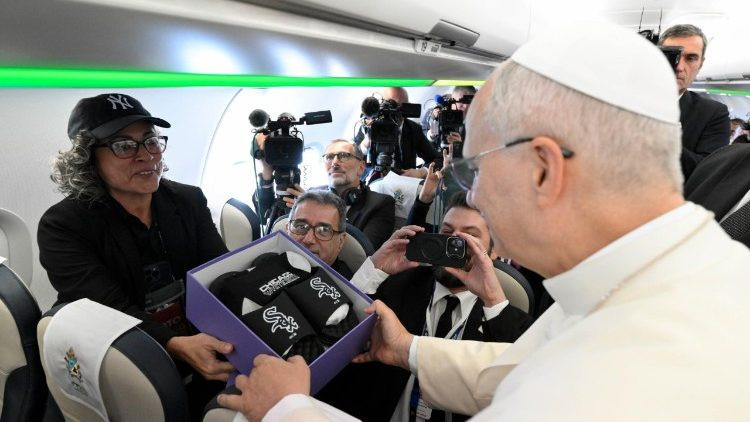 Ezt követte ülésről ülésre haladva minden egyes újságíró üdvözlése. Ezt a hagyományt az előd, Ferenc pápa indította el, és mára már viccelődés, nyilatkozatok és rövid megjegyzések, szelfik, fotók kísérik, és a sajtósok ilyenkor áldást kérnek önmaguknak, barátaiknak és családtagjaiknak. És mindenekelőtt az ajándékok cseréjének ideje ez. Leó pápa esetén is ez történik. Az újságírók számos ajándékot adtak át. Az első egy dupla kollázs a legérdekesebb pillanatképekből, ezeket a León de Perú és a Leo from Chicago című dokumentumfilmben láthattunk, amelyeket az elmúlt hónapokban a Radio Vaticana – Vatican News készített. Az egyiken helyet kapott az a fotó is, amely vírusként terjedt a közösségi médiában, ezen a nagyon fiatal Prevost látható, aki az 1980-as években a Blues Brothers filmhez öltözött, John Landis kultikus filmjének chicagói bemutatója alkalmából. A pápa rámutat, és hangos nevetésben tör ki: „Ah, gyönyörű!” A kezében egy Szent Ágoston-érem is van – ezúttal Doltonból, gyermekkori otthonából –, hogy oltalmat adjon az apostoli út során.