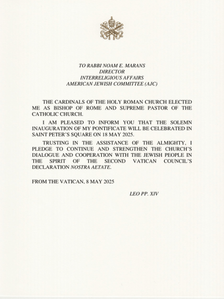XIV. Leó pápa május 8-án, megválasztása napján aláírt levelét május 13-án tették közzé az American Jewish Committee X-oldalán; kifejezték, mennyire meghatotta őket, hogy Leó pápa fontosnak tartotta, hogy megválasztása után nem sokkal máris jelezze, elkötelezett a katolikus–zsidó kapcsolatok megerősítésében.