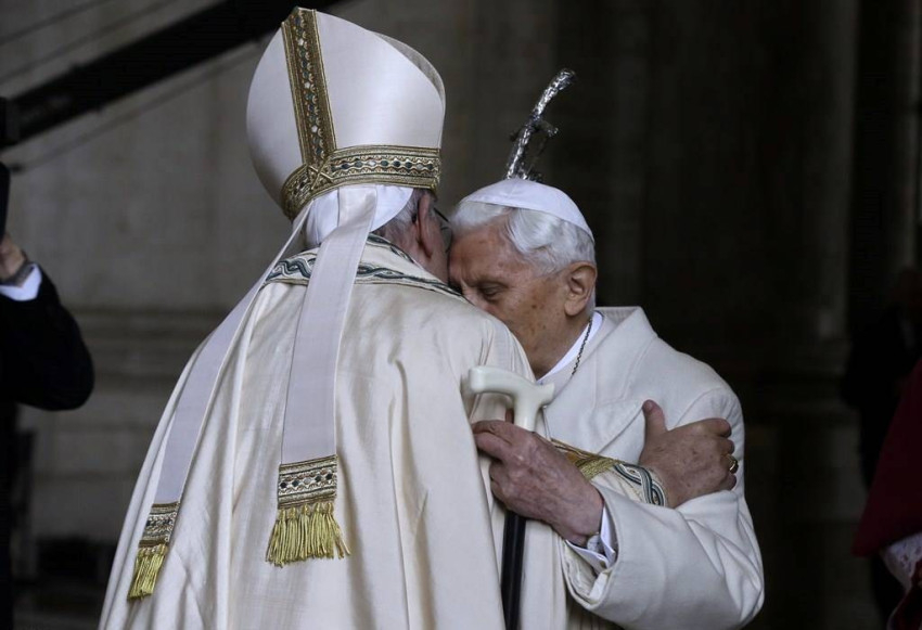 Ferenc pápa után közvetlenül elődje, XVI. Benedek emeritus pápa is belépett a szent kapun, egykori titkára, Georg Gänswein érsek kíséretében. Botjára támaszkodva lépett a küszöbre, majd rövid imádság után belépett a Szent Péter-bazilikába, ahol Ferenc pápa köszöntötte őt, és testvéri kézfogással üdvözölték egymást.