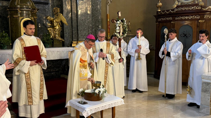 A szertartás következő állomása a székesegyház keresztelőkútjánál volt, ahol a keresztségre való emlékezés jegyében a püspök megáldotta a vizet. A keresztség az Újszövetség első szentsége, amely által a megkeresztelt ember Krisztushoz kapcsolódva elnyeri a fogadott fiúság Lelkét, és Isten gyermekévé válik. A főpásztor a keresztelőkútnál megáldott vízzel bűnbánati szertartásként meghintette a híveket.