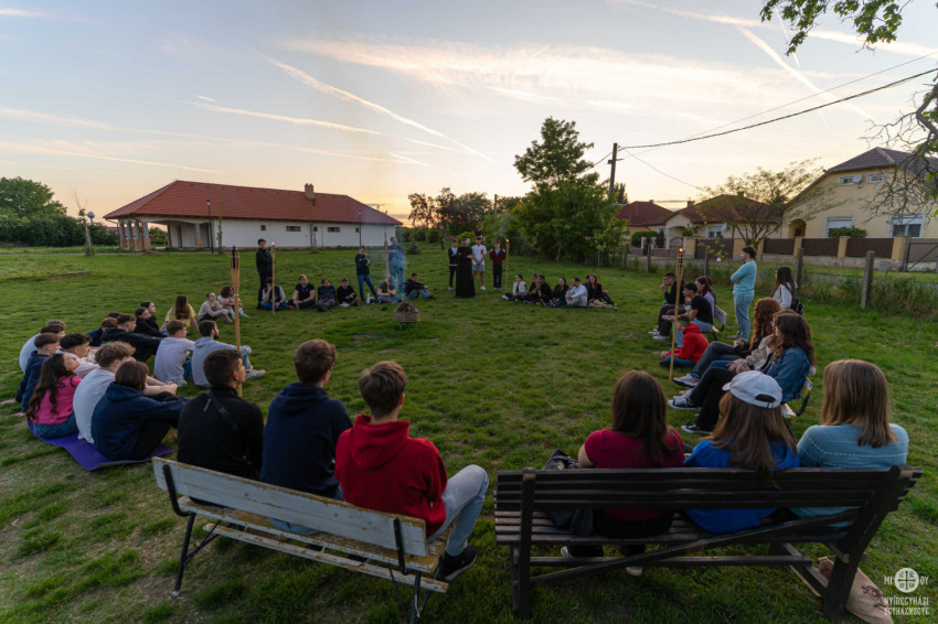Este a Dudás Miklós Görögkatolikus Két Tanítási Nyelvű Általános Iskola és Alapfokú Művészeti Iskola udvarán, tábortűz körül hallgatták Trella Tibor atya elmélkedését Krisztus tanítványait köszöntő szavairól: „Békesség nektek!” (Jn 20,19) A szavakkal, melyekkel Leó pápa is köszöntötte megválasztása után a világot.