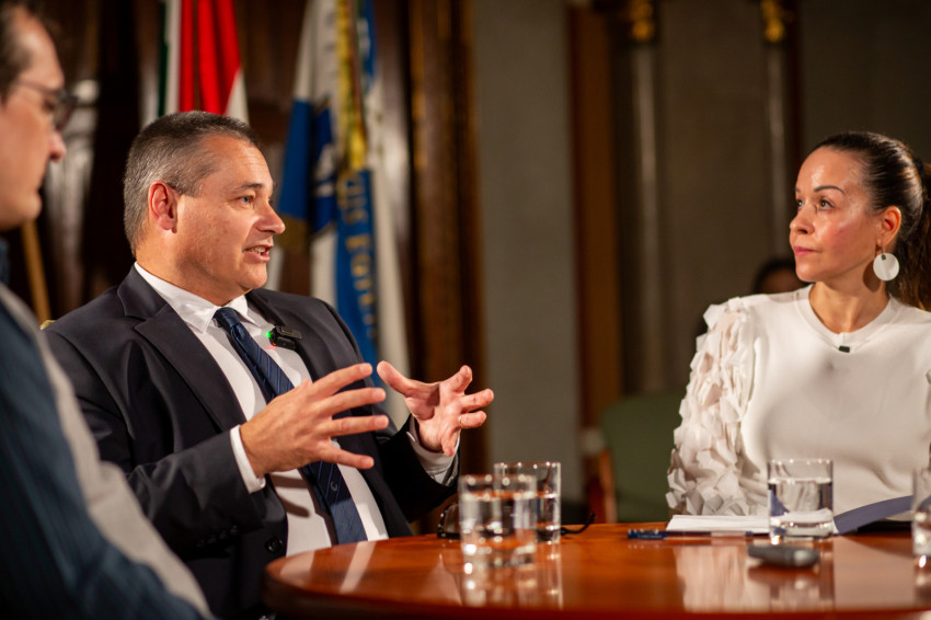 A kerekasztal-beszélgetés résztvevői Laurinyecz Mihály, a PPKE Hittudományi Kara Erkölcsteológiai Tanszékének tanszékvezető egyetemi docense; Almási Zsolt, a Bölcsészet- és Társadalomtudományi Kar Angol Nyelvű Irodalmak és Kultúrák Tanszékének tanszékvezetője; Tornai Kálmán, az Információs Technológiai és Bionikai Kar (ITK) oktatásfejlesztésért felelős dékánhelyettese, a mesterséges intelligencia alkalmazásai szakirányú továbbképzés felelőse és Aczél-Partos Adrienn, a Jog- és Államtudományi Kar (JÁK) Jogi Informatikai Oktatási Csoportjának képviselője, a kutatásmódszertan oktatója voltak.