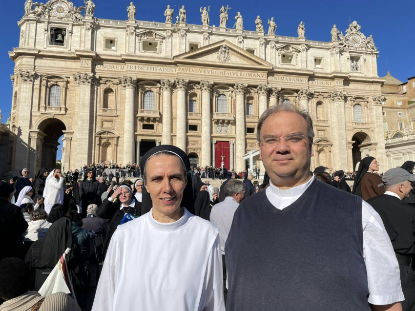 Kakucs Adél Petra OP, az Árpád-házi Szent Margitról nevezett Szent Domonkos Rendi Nővérek Apostoli Kongregációjának általános főnöknője, a Magyar Rendfőnöknői Konferencia (MRK) elnöke és Zsódi Viktor SchP a Szent Péter téren.