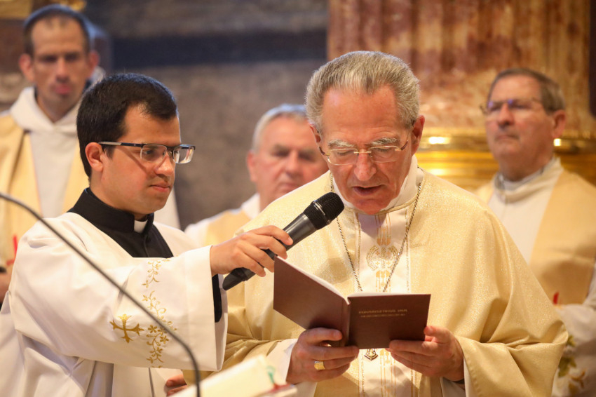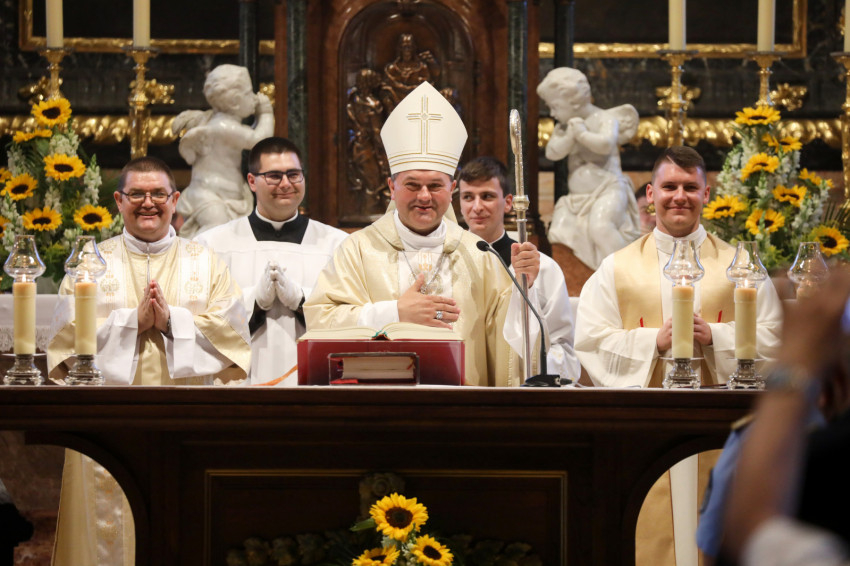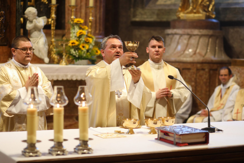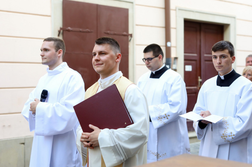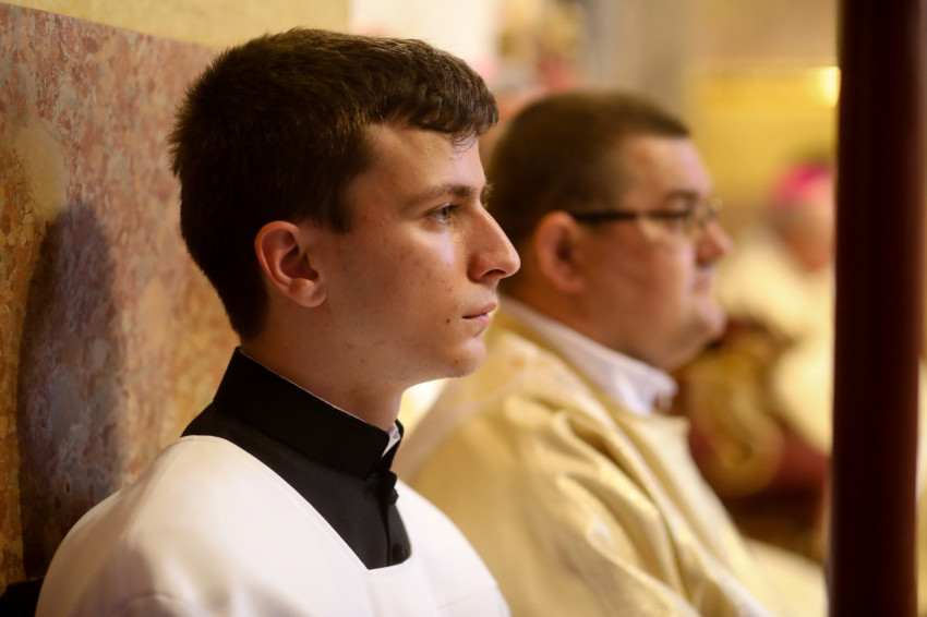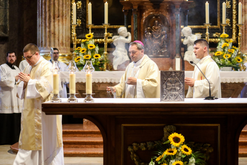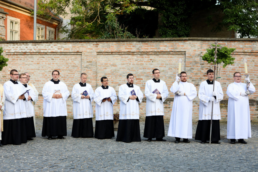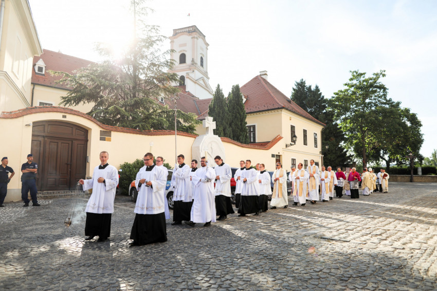 A belülről felállványozott bazilikába hosszú sorban vonult be a szentmise elején a Győri Egyházmegye papsága, a székesegyház székeskáptalanjának kanonokjai, a győri bencés perjelség képviselői és növendékei Sárai-Szabó Kelemen perjellel, valamint a Brenner János Hittudományi Főiskola növendékei.