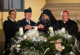 december 2. | 17:22Ökumenikus adventi gyertyagyújtás DebrecenbenNovember 30-án, vasárnap a hagyományokhoz hűen közösen gyújtották meg az első adventi gyertyát a római katolikus, a görögkatolikus és a református egyház képviselői Debrecen polgármesterével a Kossuth téren. Aznap délután kigyúltak a városi díszkivilágítás fényei is.