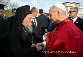 november 29. | 16:35Adjatok hálát az Úrnak, mert jó! – XIV. Leó pápa és Bartholomaiosz pátriárka közös nyilatkozataNovember 29-én délután az isztambuli Ökumenikus Patriarchátus palotájában XIV. Leó pápa és I. Bartholomaiosz pátriárka bemutatták egymásnak delegációikat, majd közös nyilatkozatot írtak alá találkozójuk és az első nikaiai egyetemes zsinat ezerhétszázadik évfordulója alkalmából.... »
