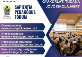 október 14. | 19:33Gyakorlati tudás a jövő iskolájáért – Sapientia Pedagógus Fórum előadás-sorozat indul BudapestenA Sapientia Pedagógus Fórum előadásaira várják az érdeklődő pedagógusokat. Az október 14-én, kedden kezdődött előadás-sorozat helyszíne: Sapientia Szerzetesi Hittudományi Főiskola (1052 Budapest, Piarista köz 1.). A programok ingyenesek, de regisztrációhoz kötöttek.