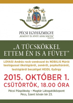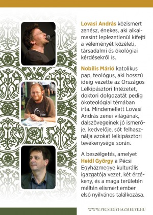 Különlegesnek ígérkező találkozás helyszíne lesz a pécsi Magtár Látogatóközpont október 1-én, csütörtökön 18 órakor. A Teremtés hetén, Ferenc pápa Laudato si' kezdetű enciklikája magyar fordításának megjelenése alkalmából. Nobilis Márió teológussal és Lovasi András zenésszel beszélget Heidl György.
