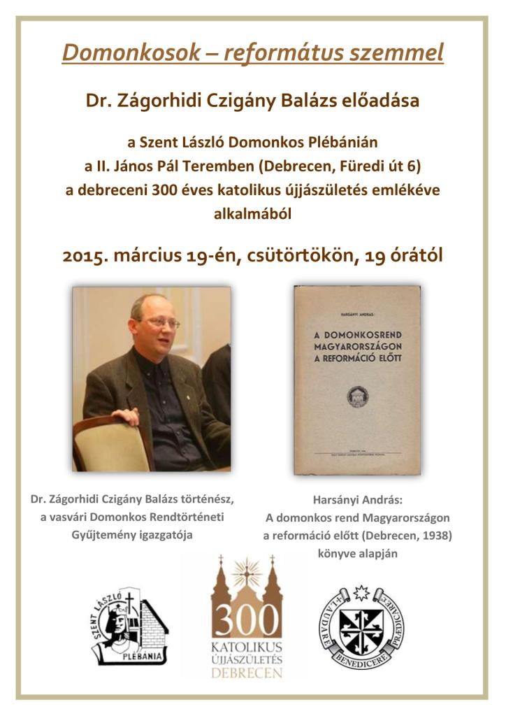 Domonkosok – református szemmel címmel tart előadást Zágorhidi Czigány Balázs történész-muzeológus (Vasvár, Domonkos-gyűjtemény) március 19-én, csütörtökön 19 órakor Debrecenben a II. János Pál Intézetben (Füredi u. 6.). Az előadás a debreceni 300 éves újjászületés emlékéve alkalmából kerül megrendezésre.