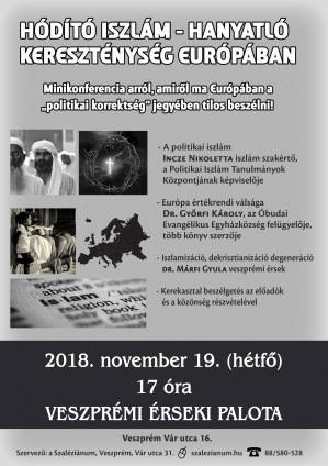 Hódító iszlám – hanyatló kereszténység Európában címmel a Veszprémi Érseki Palota nagytermében (Veszprém, Vár utca 16.) 2018. november 19-én, hétfőn 17 órától minikonferenciát rendeznek arról, amiről ma Európában a „politikai korrektség” jegyében tilos beszélni.