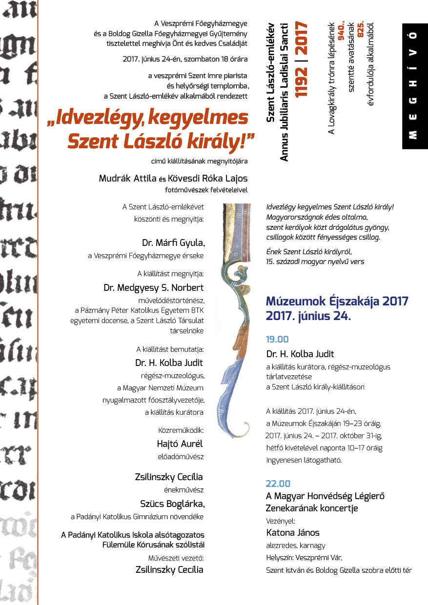 Program: A Szent László-emlékévben, a Lovagkirály trónra lépésének 940., szentté avatásának 825. évfordulója alkalmából rendezett kiállítás megnyitója a Múzeumok Éjszakája programsorozathoz kapcsolódóan.