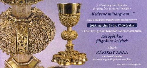 2015. március 28-án, 17 órakor kerül sor az előadássorozat következő rendezvényére, Későgótikus filigrános kelyhek címmel, az esztergomi Főszékesegyházi Kincstár Panorámatermében.