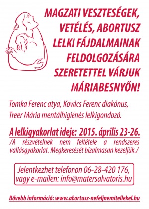 Magzati veszteségek, vetélés, abortusz lelki fájdalmainak feldolgozására lelkigyakorlatot tart Kovács Ferenc diakónus és Treer Mária mentálhigiénés lelkigondozó Máriabesnyőn. Lelki kísérő: Tomka Ferenc atya