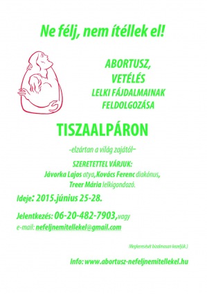 Magzati veszteségek, vetélés, abortusz lelki fájdalmainak feldolgozására lelkigyakorlatot tart Tiszaalpáron Kovács Ferenc diakónus és Treer Mária mentálhigiénés lelkigondozó. Lelki kísérő: Jávorka Lajos atya