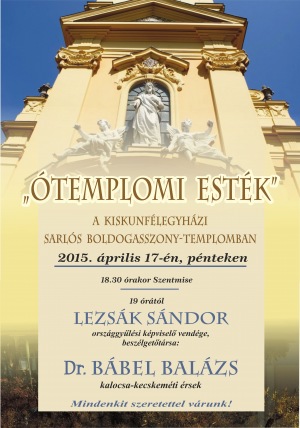 Ótemplomi Esték-re várják az érdeklődőket április 17-én, pénteken 19 órakor a kiskunfélegyházi Sarlós Boldogasszony-templomban  (6100 Kiskunfélegyháza Béke tér 1.).