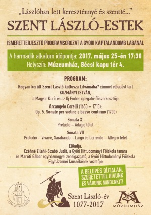 Szeretettel hívjuk és várjuk Önöket a Győri Egyházmegye által szervezett Szent László-estek című programsorozat 2017. május 25-én 17 óra 30 perckor kezdődő alkalmára a győri Múzeumházban (Bécsi kapu tér 4.), amelynek keretében Kuzmányi István, a Magyar Kurír és az Új Ember igazgató-főszerkesztője tart előadást Hogyan került Szent László kultusza Litvániába? címmel.