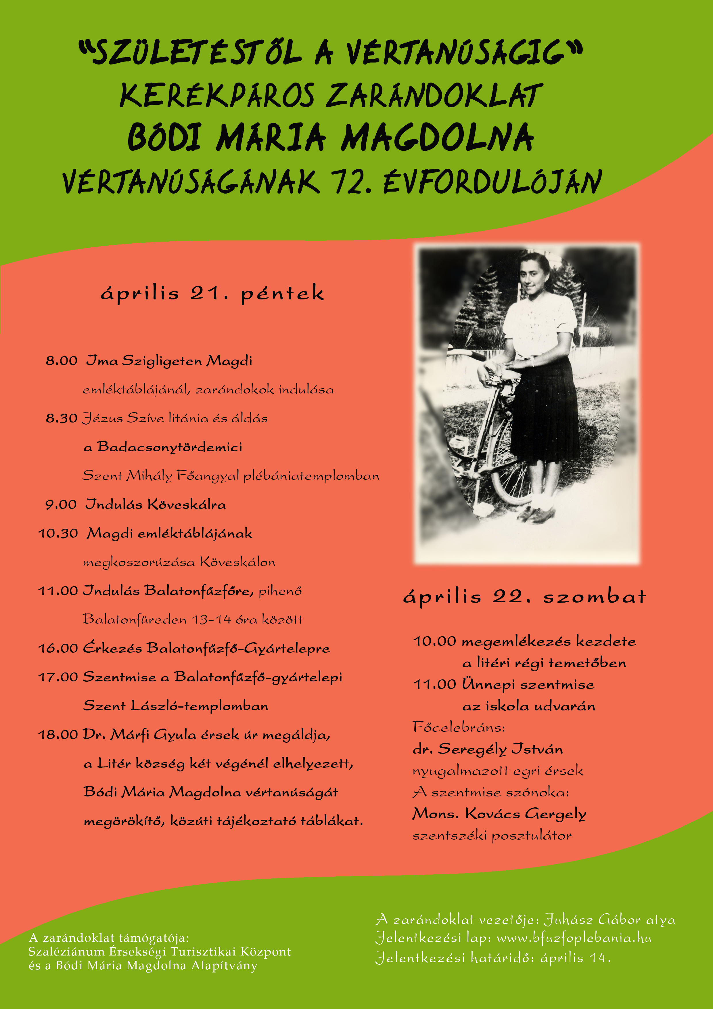 18:00 Dr. Márfi Gyula érsek úr megáldja a Litér község két végénél elhelyezett Bódi Mária Magdolna vértanúságát megörökítő, közúti tájékoztató táblákat.