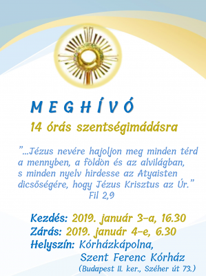 Időpont: 2019. január 3., csütörtök 16:30 órától 2019. január 4., péntek 06:30 óráigHelyszín: Kórházkápolna, Szent Ferenc Kórház (Budapest, II.ker., Széher u. 73.)