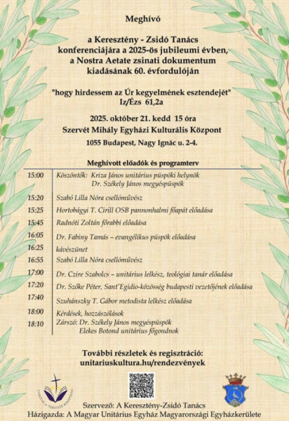 Éppen 60 éve, 1965. október 28-án a II. vatikáni zsinat keretében adták ki a Nostra aetate kezdetű, nagy jelentőségű nyilatkozatot az Egyház nem keresztény vallásokkal való kapcsolatáról. Ennek kapcsán rendezi meg a Keresztény-Zsidó Tanács idei konferenciáját október 21-én, melyre mindenkit szeretettel várnak.