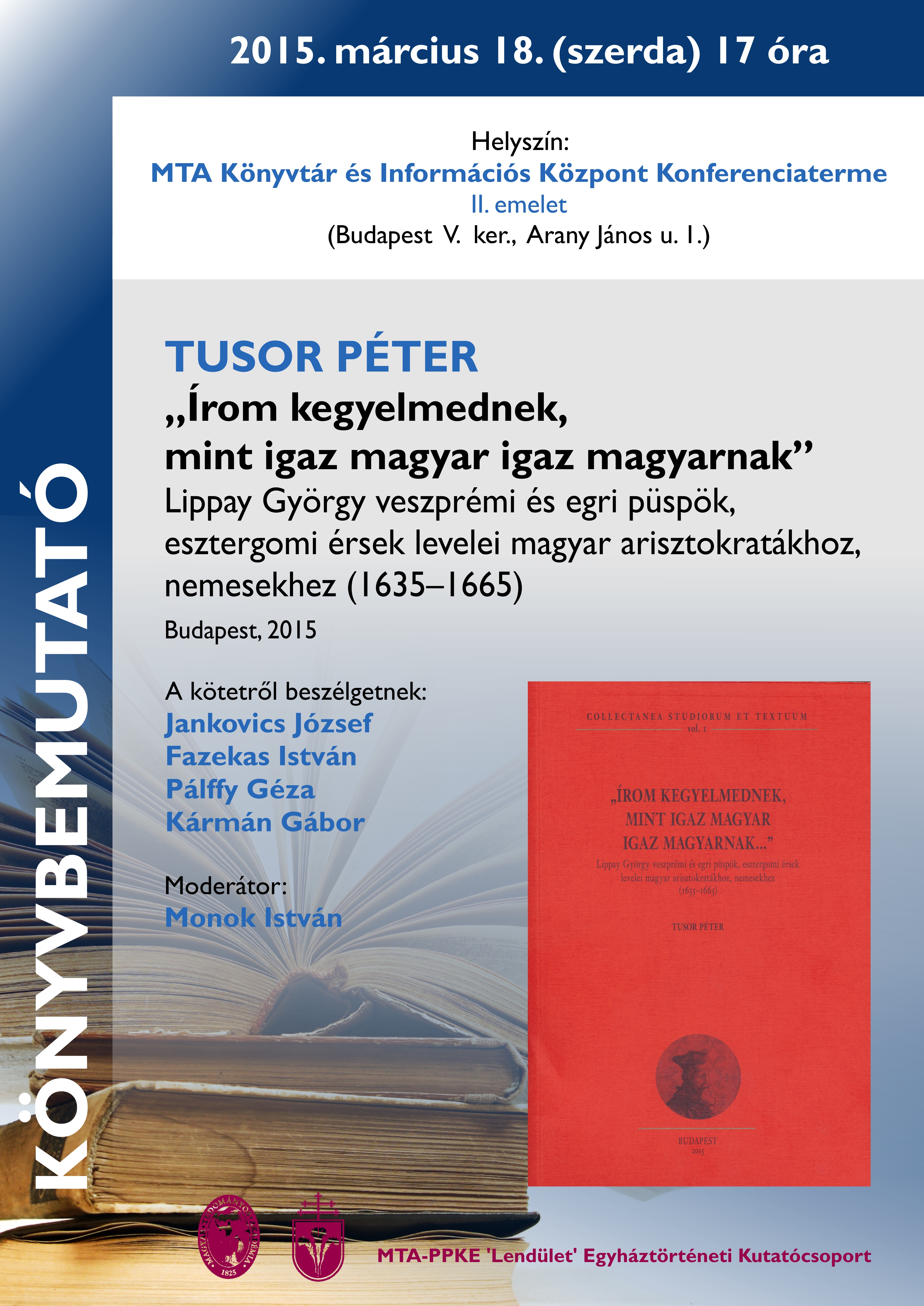 A kötet címe: Tusor Péter – „Írom kegyelmednek, mint igaz magyar igaz magyarnak” Lippay György veszprémi és egri püspök, esztergomi érsek levelei magyar arisztokratákhoz, nemsekhez (1635–1665) Budapest, 2015