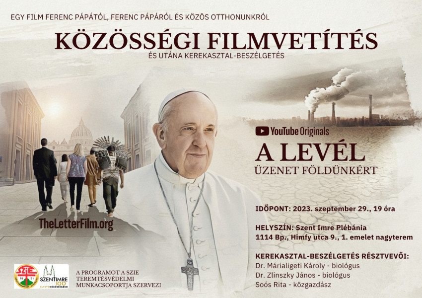 Szeptember 29-én, pénteken 19 órára a Szent Imre Plébánia Himfy utca 9. szám alatti első emeleti nagytermébe hívunk és várunk, ahol Ferenc pápa "Áldott légy"enciklikája nyomán készült A levél című film kerül közösségi vetítésre, amit egy kerekasztal - beszélgetés követ.