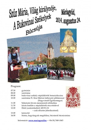 Boldogságos Szűz Mária Világ Királynője ünnepén tartják a Bukovinai Székelyek búcsúját. 9 órakor a bukovinai székely népdalkörök bemutatkozása lesz. A 10 órakor kezdődő ünnepi szentmisét Kiss Márton belfenyéri plébános (Nagyváradi Egyházmegye) mutatja be. 11 órakor Sebestyén István mesemondó előadására kerül sor. 11.30-kor közös énekléssel zárul az ebéd előtti program. 13 órakor keresztút, 14 órakor litánia és a zarándokok búcsúztatása lesz.