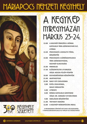 Március 23-án hétfőn 13:00 órakor érkezik a máriapócsi kegykép a nyíregyházi római katolikus társ-székesegyház elé, ahonnan processzióval kísérik a görögkatolikus társ-székesegyházhoz, ahol 14:00 órakor helyezik el. A parakliszt 15:00 órakor imádkozzák, 17:30-kor az Előszenteltek Liturgiáját, majd 19:00 órától kezdődnek az egyházközségi köszöntések. 21:00 órakor akathisztoszt énekelnek, amelyet 22:00 órakor a nagy esti zsolozsma követ. Az éjszakai virrasztást és a 6:00 órai utrenyét követően Seregély István érsek mutat be reggel 8:00 órakor római katolikus szentmisét. A 11:00 órai trithekti imaóra után az Istenszülő Mária-kép útnak indul Máriapócsra.