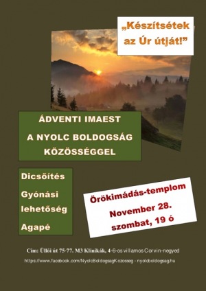 A Nyolc Boldogság Közösség szeretettel vár mindenkit az adventi imaestre, november 28-án, szombaton 19 órakor az Örökimádás-templomban.