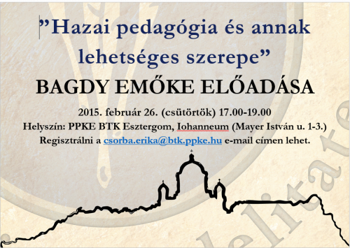 Hazai pedagógia és annak lehetséges szerepe címmel tart előadást Bagdy Emőke február 26-án, csütörtökön 17 és 19 óra között Esztergomban (PPKE BTK Esztergom, Iohanneum – Mayer István u. 1–3.).