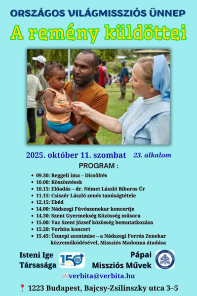 Október 11-én, szombaton tartja az idén 150 éves Isteni Ige Társasága (verbita rend) és a Pápai Missziós Művek a Világmisszió Országos Ünnepét a missziós vasárnapra készülve.