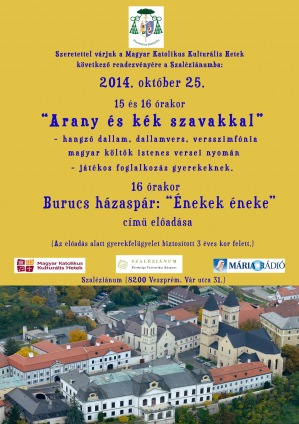 Október 25-én, szombaton Arany és kék szavakkal címmel hangzó dallam, dallamvers, versszimfónia magyar költők istenes versei nyomán – játékos foglalkozás gyerekeknek. Kezdés: 15 és 16 órakor