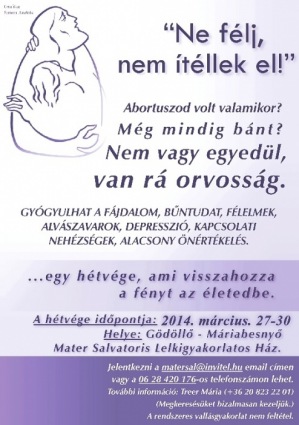 Március 27-től 30-ig (csütörtök vacsorától vasárnap ebédig) Ne félj, nem ítéllek el! címmel lelkigyakorlatot szerveznek az abortusz miatt szenvedők részére Gödöllő-Máriabesnyőn, a Mater Salvatoris Lelkigyakorlatos Házban.
